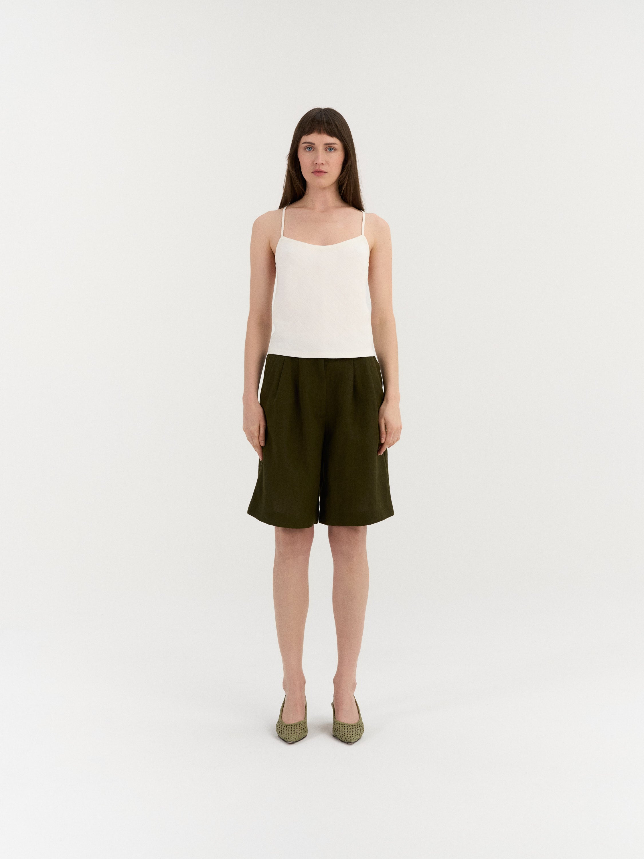 Sleeveless top with a straight neckline and slim shoulder straps. The front features a clean, minimal silhouette, while the back is designed with crossed straps and an open back detail with adjustable lace-up ties. The lace-up closure allows for an adjustable fit at the back. Finished with a straight hem.