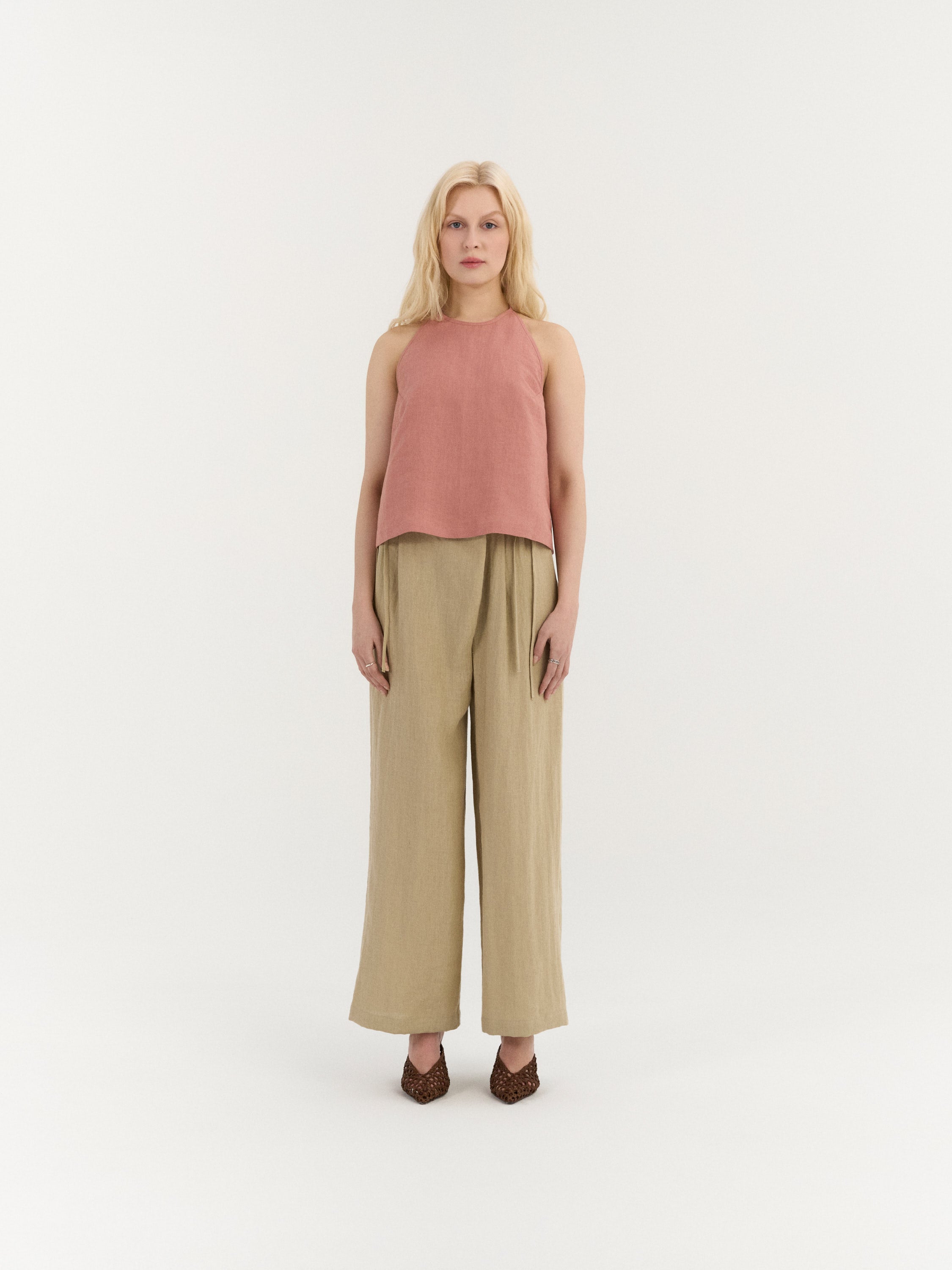 A relaxed halter-neck top with a softly flowing silhouette and an open back design. The neckline ties at the back of the neck, while two adjustable back straps create a delicate, minimal structure and allow for a comfortable fit.