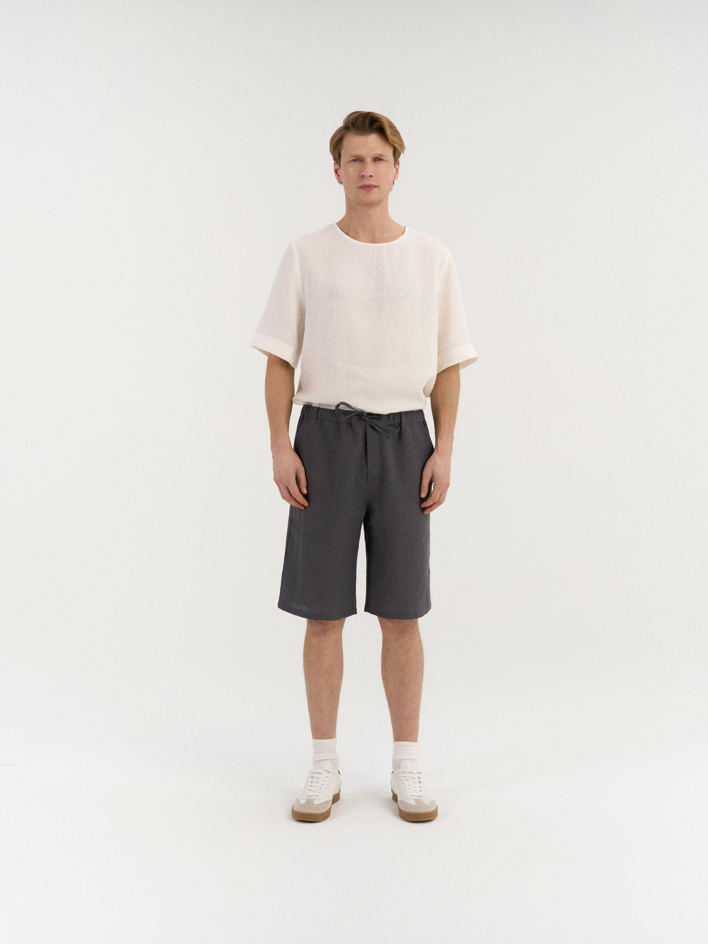 Een comfortabele linnen short met een elastische tailleband en verstelbaar trekkoord voor een aangename pasvorm. De short heeft een rechte pijp, discrete steekzakken aan de zijkanten en is licht en ademend.